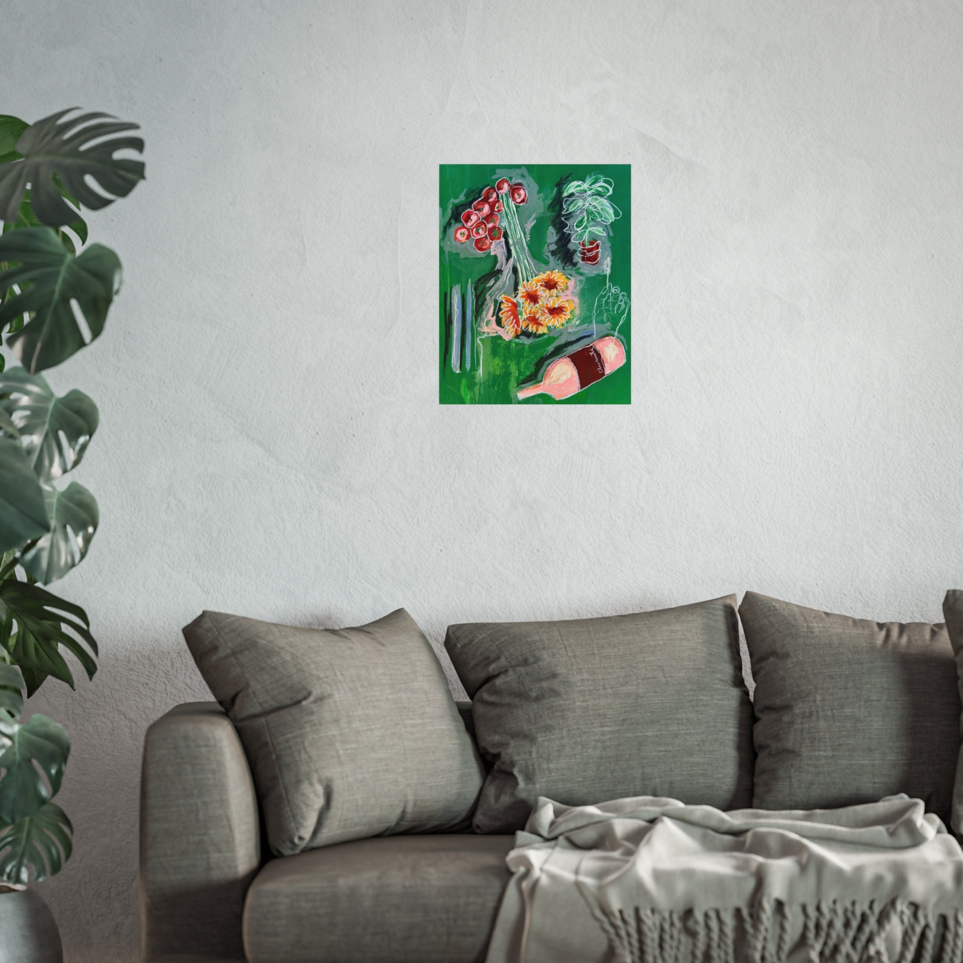 A lively fine art poster that brings a spontaneous, painterly moment into the room. Broad, confident brushstrokes shape a tabletop still life—clustered cherries, sunlit marigolds, a casually tipped bottle—set against a saturated green field. The composition feels like a quick, joyful snapshot from a leisurely afternoon: warm, a little messy, full of color and life. Hung above a sofa or in a kitchen nook, it adds an artisanal, expressive touch and invites conversation. The smooth matte surface keeps glare low while preserving the depth and texture of the giclée print.