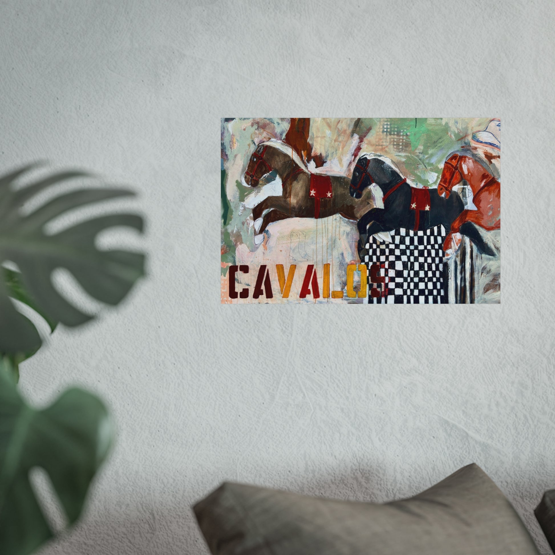 A lively fine art poster that brings motion and character to any wall. Painted horses leap across a textured, layered background in warm earth tones and muted greens, with playful graphic elements—checkerboard accents and stenciled “CAVALO” lettering—adding modern contrast. The giclée-quality reproduction on gallery-grade 220 gsm paper preserves brushstrokes, subtle washes, and rich pigment for an authentic studio-to-wall feel. Whether displayed alone or in a curated gallery wall, this piece reads as both energetic and sophisticated, inviting conversation and a sense of movement into living rooms, studios, or entryways.